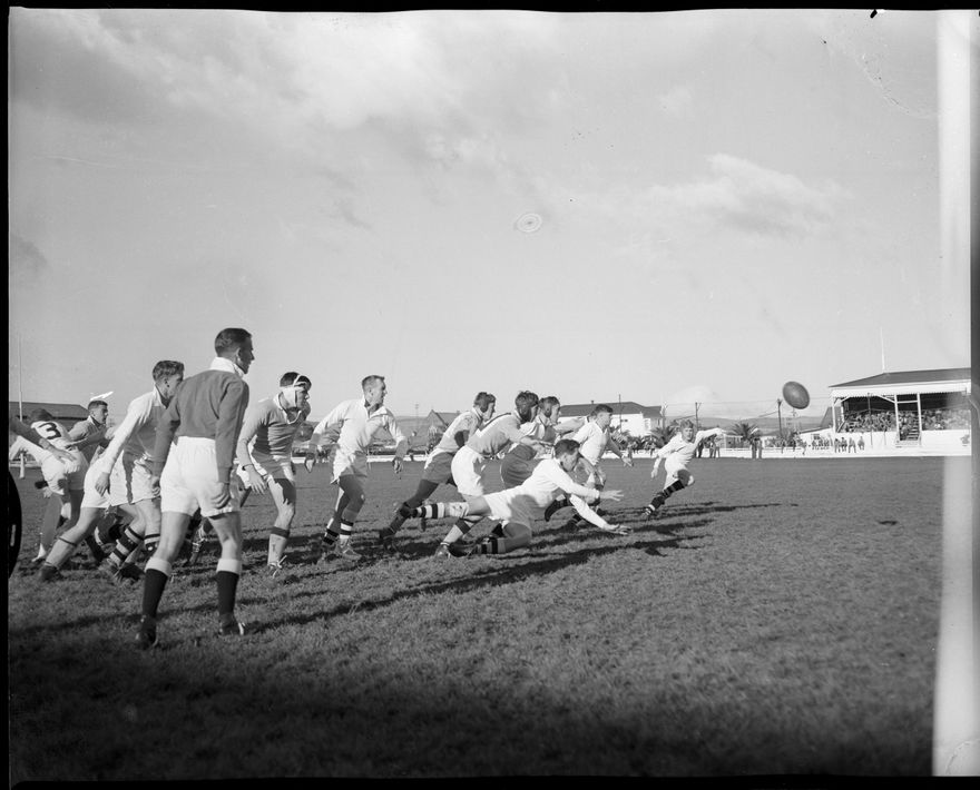 This image was taken for a story that ran in The Manawatu Evening Standard on 03 July 1958, page 13: "Hardly anybody in the crowd at the Oval on Saturday expected the T.O.B. five-eighth C. Wright to enjoy playing behind the scrum in his final appointment as half-back. But Wright himself set them all thinking with a first class display. Here with plenty of room to spare, is a typical dive pass he executed so well."