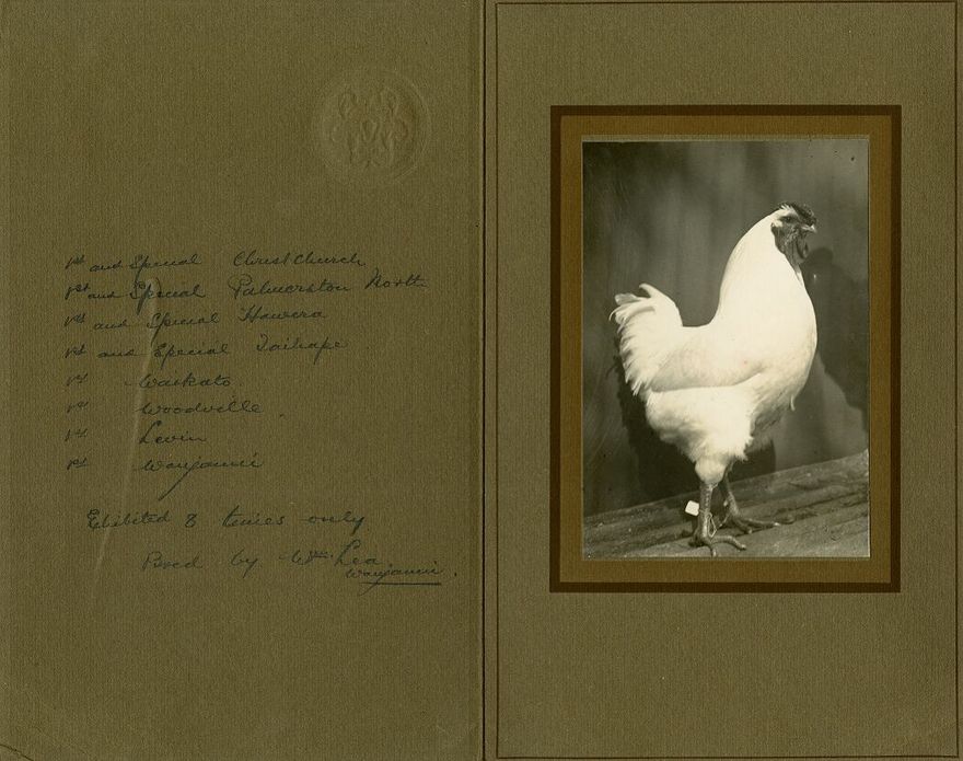 This prize winning cockerel was owned and bred by Reverend W.Lea, Aramaho, Wanganui. The date is thought to be 1923. The cockerel won prizes in poultry shows in Christchurch, Palmerston North, Hawera, Taihape, Waikato, Woodville, Levin and Wanganui.