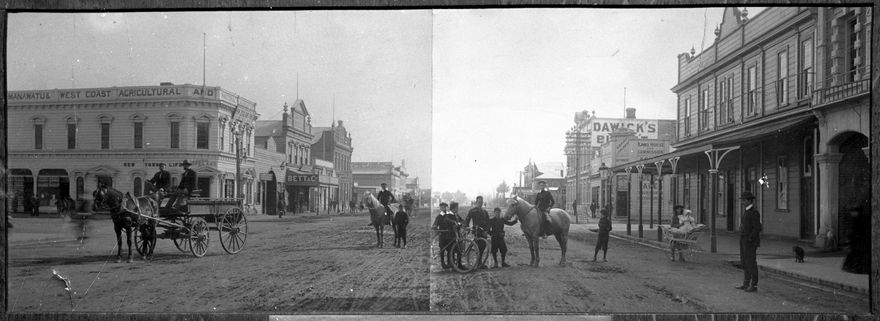 This composite panorama was published in the Auckland Weekly News on 23 June 1904. The realism of the panorama is marred by the presence of the same children on both sides of the frame.
