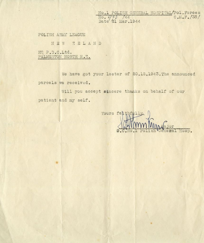 Letter from the No. 1 Polish General Hospital, to the Polish Army League, thanking them for parcels sent. The Polish Army League, founded in Palmerston North in WWII, corresponded with and sent parcels to Polish soldiers who served with the allies in World War Two.