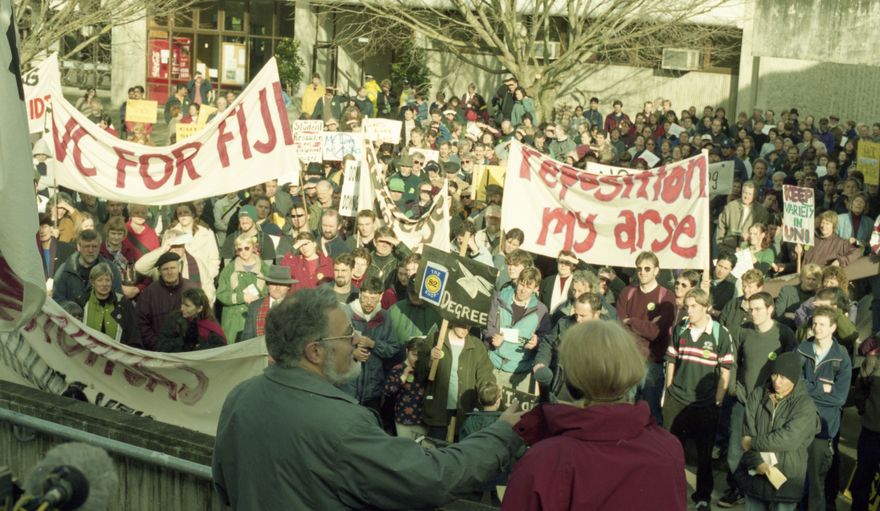 ‘Repositioning’ was the infamous title given to a staff restructuring process at Massey University in 2000 that saw multiple positions across the colleges of science, business, social sciences and humanities under threat of disestablishment. The Association of University Staff called it the ‘single biggest academic redundancy exercise in New Zealand’s history’. Driven by drops in student numbers and government funding for the tertiary sector, the review was challenged in the High Court by the association and attracted scathing criticism from staff, students, and some Palmerston North city councillors.