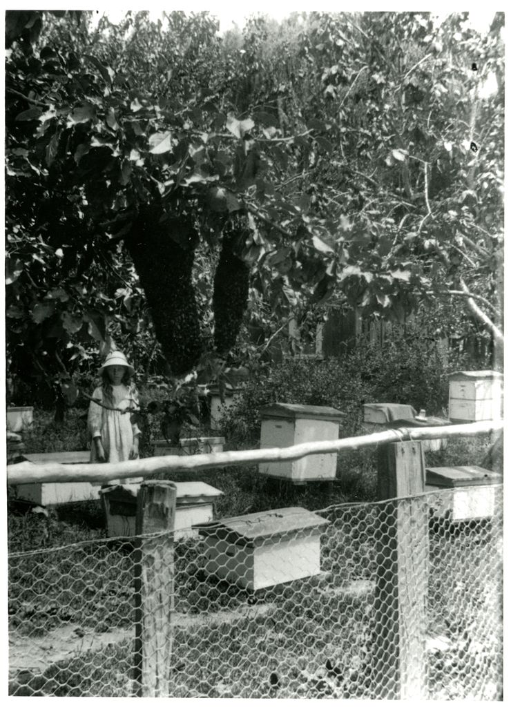 Eva Wildbore poses with a swarm of bees in the Wildbore Apiary.