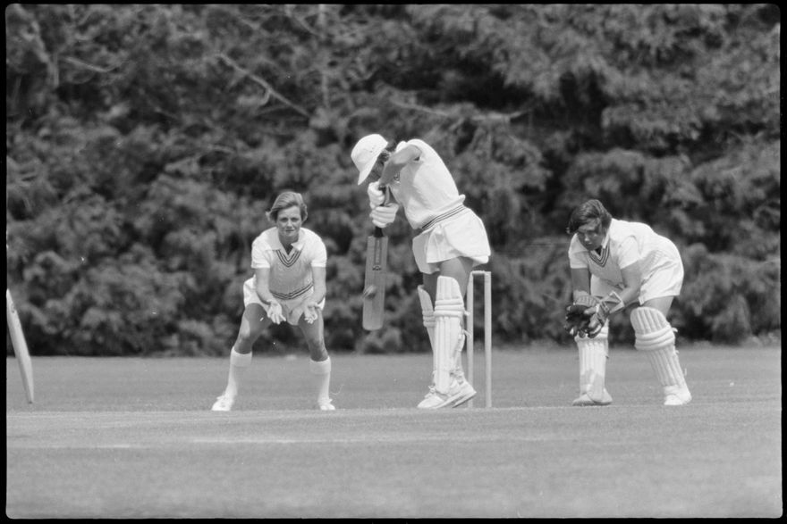 This image was taken (but not used) by the Evening Standard on 21st of January 1982. It depicts the New Zealand women’s cricket team taking on the International XI women’s team in a limited over match for the Hansell's Vita Fresh Women's World Cup 1981/1982. The match was held at Fitzherbert Park in Palmerston North. The New Zealand team won by 97 runs.