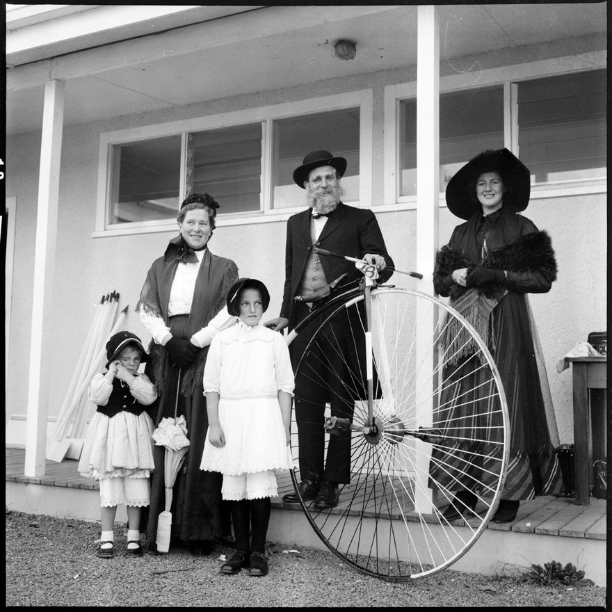 [Group in old fashioned clothes and pennyfarthing]