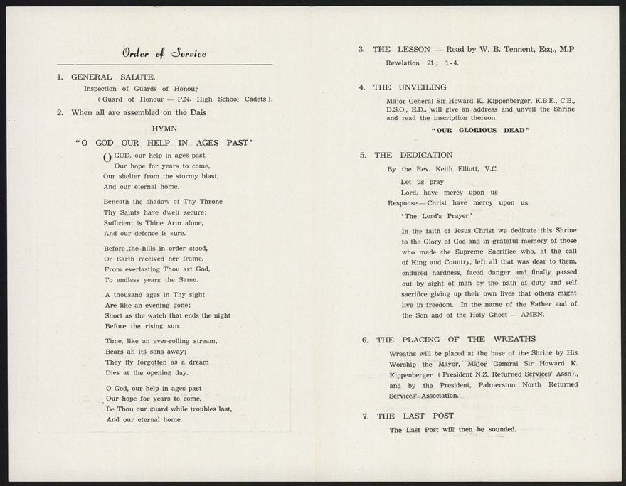 The order of service from the unveiling of the Memorial Shrine at Fitzroy Memorial Park (later known as Memorial Park). The memorial was created to remember service men and women from Palmerston North and District who gave their lives during World War One and World War Two.