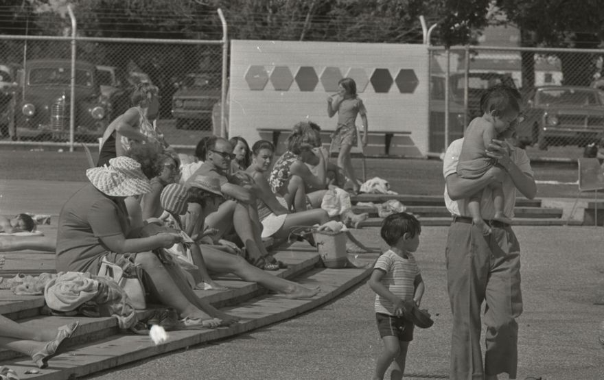 This photograph shows a crowd adults and children at the Lido Pool in Park Road, Palmerston North. The Lido swimming pool is situated on 10 acres of land previously owned by the old Awatapu Golf Club. The pool was planned in 1964, building got under was 23 January 1965 and was officially opened 15 November 1966. The Lido consists of indoor and outdoor pools.