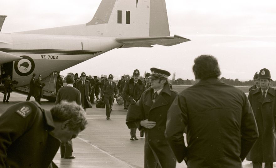 This image was taken (but not used) for a story that ran in The Manawatu Evening Standard on 01 August 1981. The Standard reported that as many as 1000 police were involved in planning for protests on game day, including the specially formed ‘Red and ‘Blue’’ riot squads. This image depicts the arrival of extra police via Airforce Hercules.