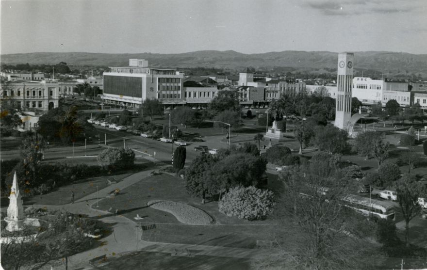 Looking across The Square, probably from the D.I.C. building now the Public Library [2008]. The Post Office is on the left of the photo and the the library building is in the centre of the photograph. The Coronation Fountain can be seen at bottom left, and the clocktower in the centre of The Square, with the wqr memorial in front of it.
