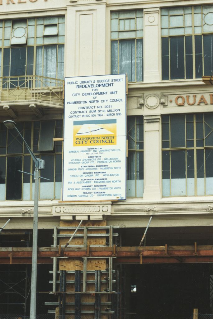 PNCC sign erected on the new Palmerston North City Library building undergoing renovation, giving cost and names of Contactors, Engineers, Architects and subcontracting managers. The building was originally the C M Ross Co Ltd department store, which extended through to George Street. The redevelopment included the demolition of shops in George Street, and the erection of a new retail block, with the Library extending above.
