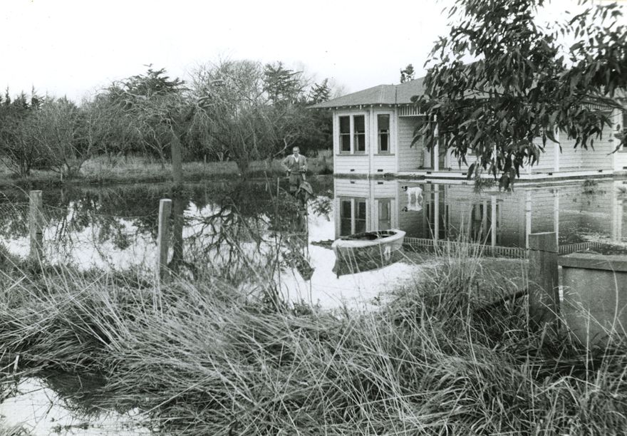 The Tiritea Stream in flood in the vicinity of Riverbank Road, now Tennant Drive, and State Highway.