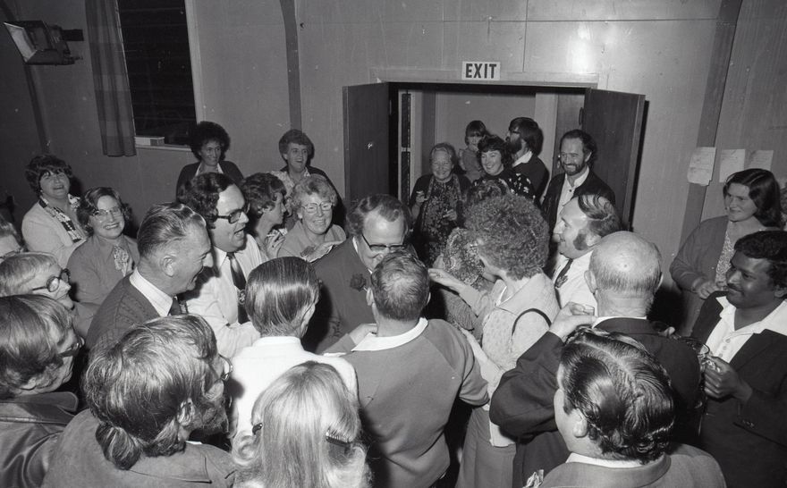 This image was taken (but not used) for a story that ran in The Manawatu Evening Standard on Monday 27 November 1978 “Walding makes political history: Backslapping well-wishers congratulate Palmerston North’s new M.P Joe Walding”