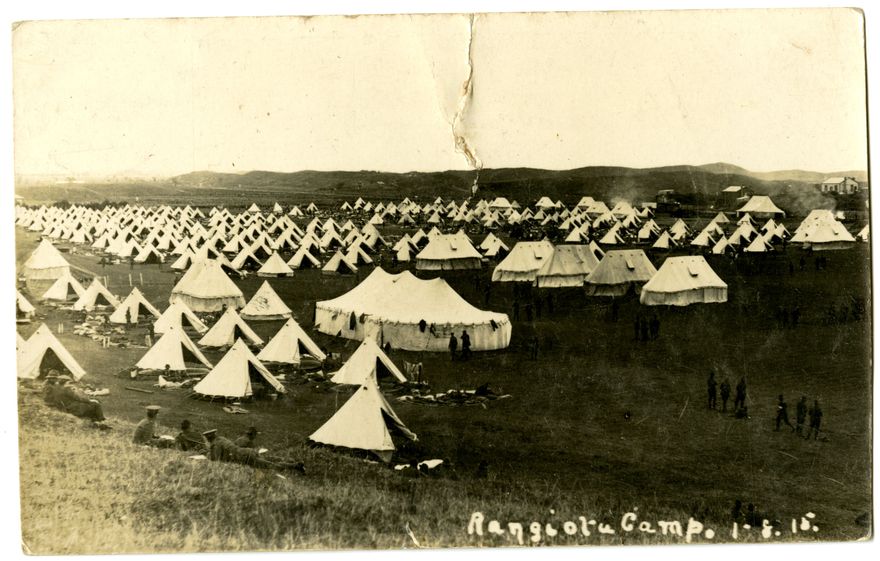Postcard announcing a soldier's arrival at the Rangiotu Camp. The date could be 1 August, 1915 or 1 August, 1918.