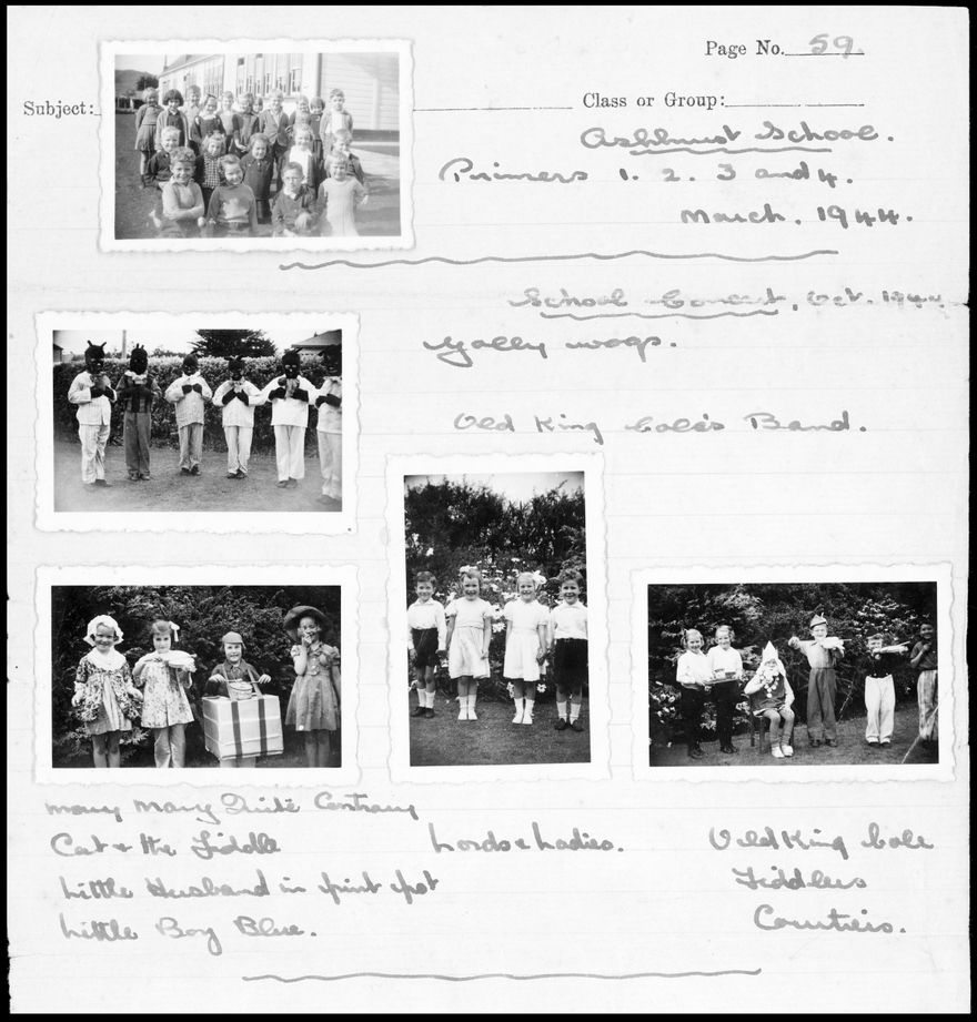Ashhurst School opened in September 1879. These photographs comes from the collection of Mrs Joan Crawley (née Butchers), a former teacher. They depict school pupils, both in their own clothes and dressed in costume for a school concert.