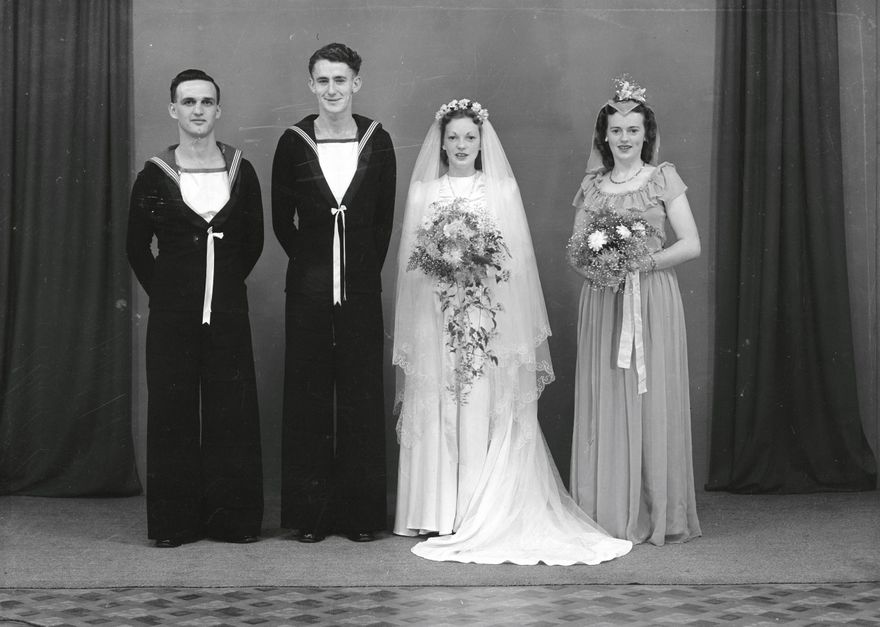 Two figures in naval uniform stand alongside two women dressed in wedding attire. Elmar Studio wedding portraits are usually composed with the bride and groom in the centre of the photograph, flanked on either side by the bridesmaid and groomsman.