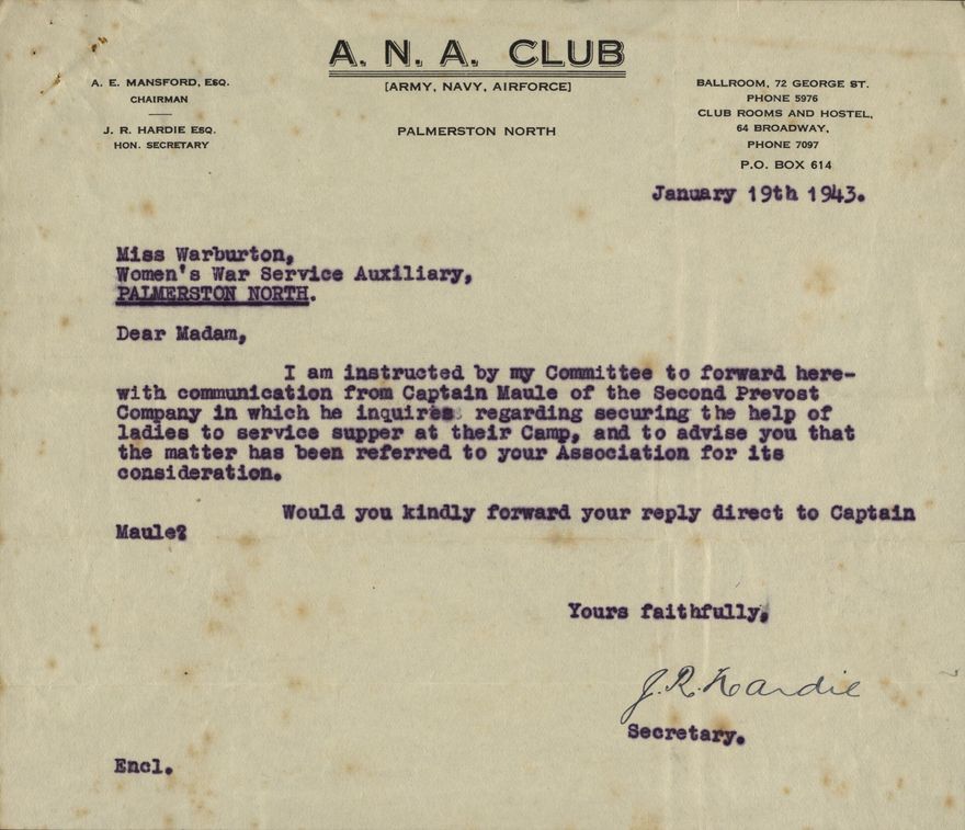 Letter to Miss Warburton of the Womens War Service Auxiliary of Palmerston North, asking if the Auxiliary can serve supper at the camp of the Second Prevost Company. Signed by J R Hardie.