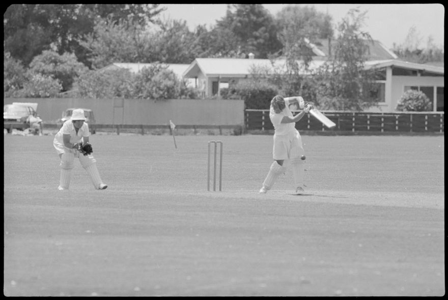 This image was taken (but not published) by the Evening Standard on either the 30th or 31st of December 1980. It depicts a moment of action from the Hallyburton Johnstone Shield 2-day match between the Auckland and Central Districts women’s cricket teams. The match was drawn.
