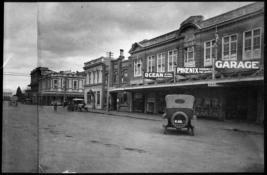 This photograph shows the businesses on Rangitikei Street, looking towards The Square. The visible corner is the intersection of Rangitikei Street and Cuba Street. The visible businesses are, from left: Phoenix Assurance Company; Ocean Fire Accident Insurance; National Bank of New Zealand; Excelsior Meat Company; Baker's Clarendon Hotel.