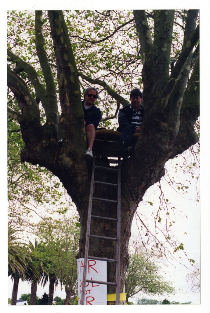 Two protestors sitting in a tree. Avenue Action was formed in protest against the Palmerston North City Council removal of trees in Fitzherbert Avenue. This was to allow for four lanes of traffic as an engineering solution to cross-river transportation problems in 1997. The Avenue Action collection is held in the Community Archives.