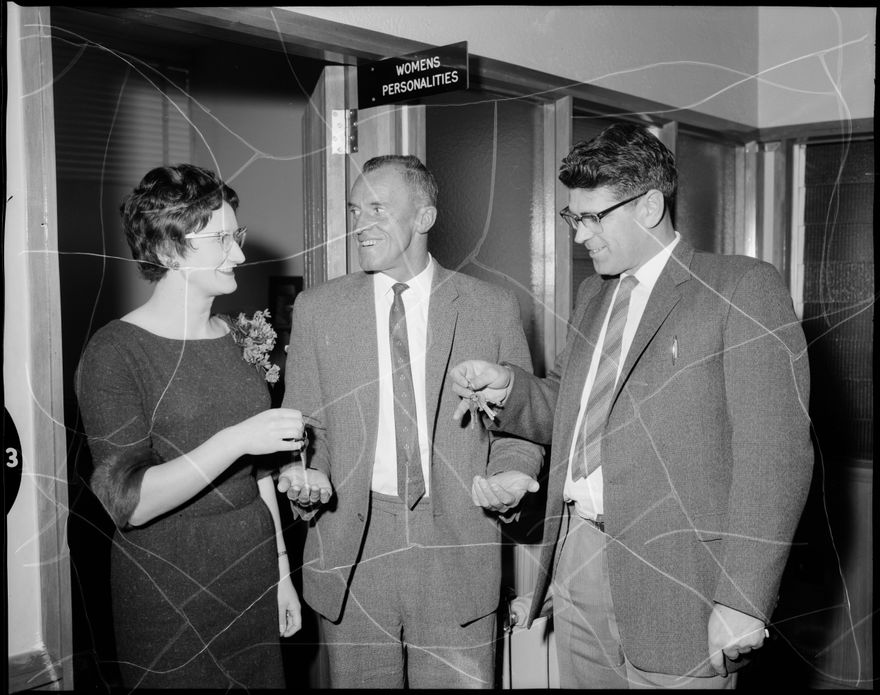 This image was taken for a story that ran in The Manawatu Evening Standard on 01 July 1961 "Two well-known radio personalities, Christeen and Wally Chamberlain, handing their office keys back to the 2ZA station manager, Mr. C.J. Sadler (centre), before leaving for their new positions in Christchurch where they will be radio announcers."