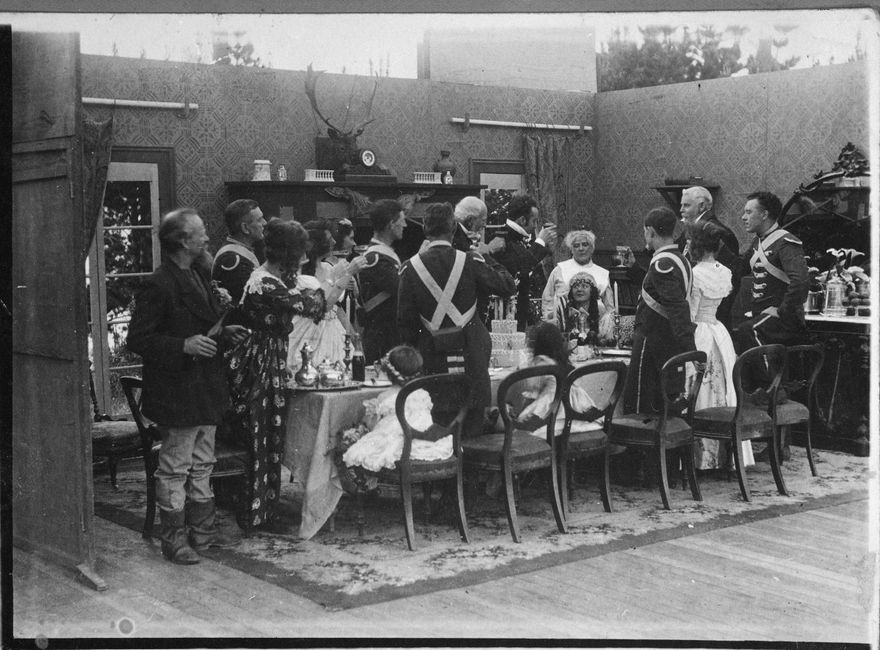This is a publicity photo for the film, "The Birth of NZ" made in 1926. It shows a re-enactment of a Scandinavian wedding. Parts of the film survive in NZ Film Archives in Wellington.