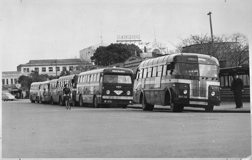 City Council buses at the Palmerston North Municipal bus station in The Square, which was attached to the back of the Ladies Rest Room. A Municipal bus service began in Palmerston North in 1921. Buses from left are: Ford; Leyland Tiger Royal; Ford; 2 Leylands, either Royals or Cubs. Reg Crutchley, Omnibus Manager is on the far left.