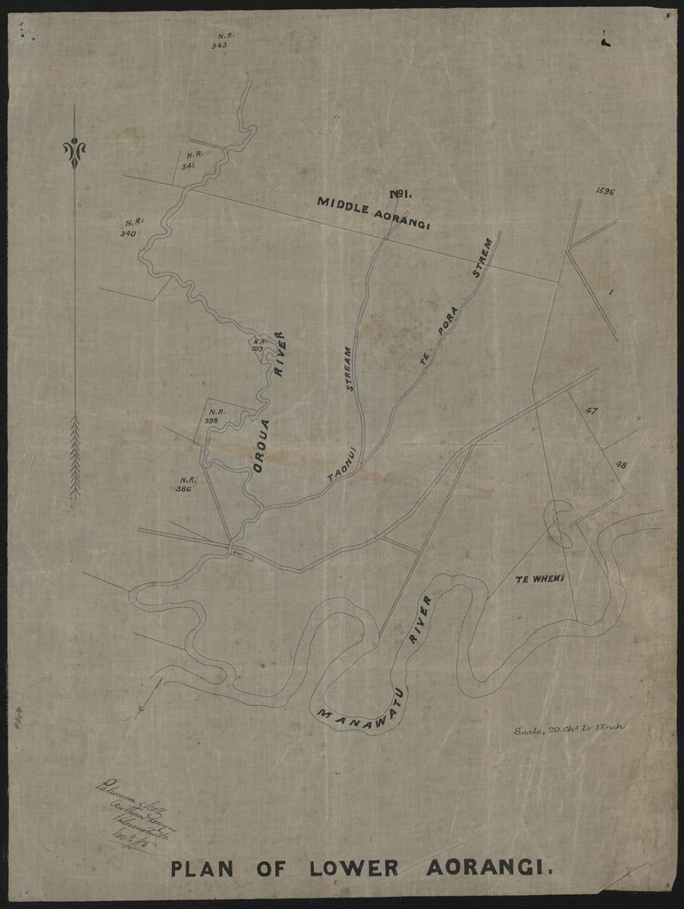 Plan of the Aorangi River showing the confluence with the Oroua River, Te Pora Stream and Manawatu River in Rangiotu. Dated March 1885.