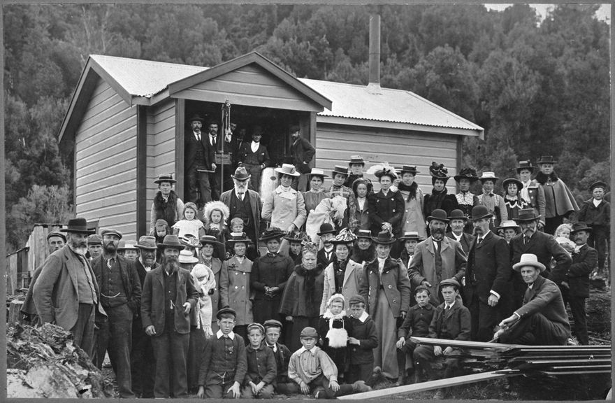 The opening of the Reikiorangi Skimming Station, near Waikanae was located adjacent to the Post Office site and from here cream was sent from Otaki by horse transport to Waikanae and then by train to Otaki. Back Row: second from left is Alf Monk with the white beard. Front Row: third from right is Byron Brown of Otaki; Fourth from left is R Stubbings who went to Reikiorangi in 1895.