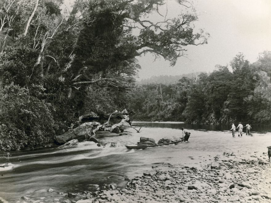 A survey party of four men hauling a canoe up the Otaki River. The Otaki River originates in the Tararua Range and flows for 45 km, firstly heading southwest through a valley in the Tararua Ranges. It turns northwest in the area of Otaki Forks, where it is joined by the Waiotauru River. After continuing through Otaki Gorge it reaches the Tasman Sea south of the settlement of Otaki Beach.