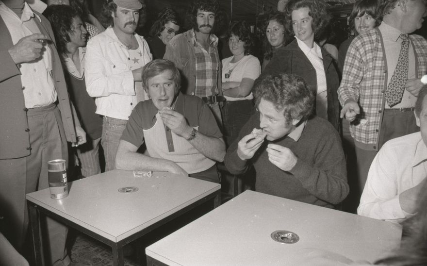 Members of the New Zealand Power Boats Association met in Palmerston North during the weekend of 17-18 May, 1975, for their annual conference and pie eating competition. The competition was held at a Palmerston North tavern, beginning at 2 pm. It took Manawatu boaties, Des Strong and Paul Godbas just 2 minutes 14 seconds to consume 8 pies specially baked for the occasion at a Palmerston North bakehouse. It was the second consecutive win for Manawatu, who took 4 mins 3 seconds to win in 1974. Taranaki boaties were second by a wide margin. Printed in the Manawatu Evening Standard 19 May 1975.