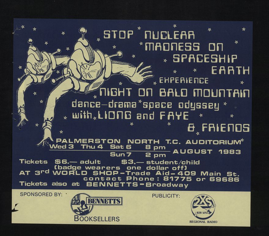 Stop nuclear madness on spaceship earth. Experience Night on Bald Mountain. Dance - drama space odyssey. With Liong and Faye & Friends. Palmerston North T.C. Auditorium. Wed 3, Thu 4, Sat 6, 8pm. Sun 7, 2pm. August 1983.Tickets $6. - adult, $3. - student/child (badge wearers one dollar off). At 3rd World Shop - Trade Aid - 409 Main St. contact Phone: 81775 or 69686. Tickets also at Bennetts - Broadway. Sponsored by: Bennetts, Booksellers. Publicity: 2XS, Regional Radio.' Part of a collection of posters that were displayed in the Public Library in the 1970s - 1980s.