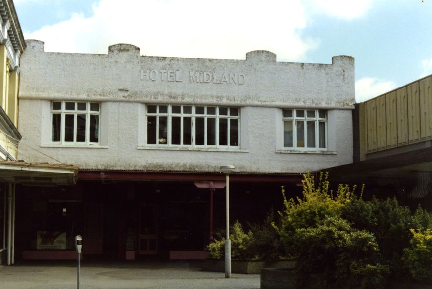 The building was constructed in 1913 for Arthur Hopwood, a prominent Palmerston North businessman, who leased the land. With the building to its right (now demolished), it became part of “Everybody’s Theatre”, and in 1928 the theatre was remodelled to become the Midland Hotel. Much of the hotel was demolished in 1966, leaving this portion remaining for retail shops.