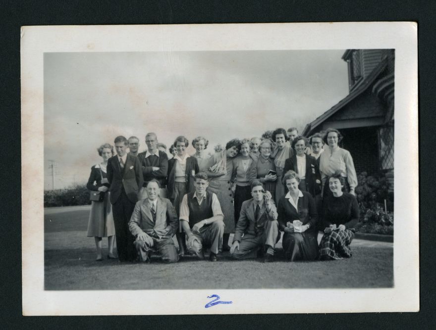 The St Andrew’s Presbyterian Church Bible Class retreat held at Feilding House, 280 Kimbolton Road. This house is now (2011) the Beauchamp Funeral Home. Standing from left: Judith Dunlop; Gordon McLaughlin; Blair Dixon; Russell Croucher; Unknown; Unknown; Helen Dunlop; Unknown; Elayne Thompson; Jean Coleman; Unknown; Janet Fraser; Beth Thompson; Unknown; Rosemary Zeinert; Flo Bailey; Jocelyn Mead. In front: Rev. Colin Sherriff; Maurice Thompson; Don Mence; Joy Bird; Pam Pigou.