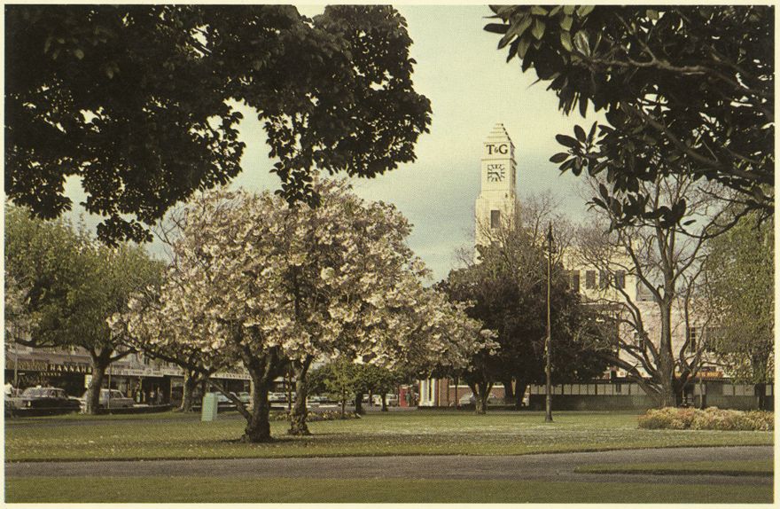 Beyond the gardens can be seen the Australasian Temperance and General Mutual Life Assurance Society Ltd (T&G) building in Palmerston North. Designed by A and K Henderson in the distinctive 'house' style developed by the firm, this iconic structure was built in 1938 and still stands today near the corner of Broadway Avenue and The Square.