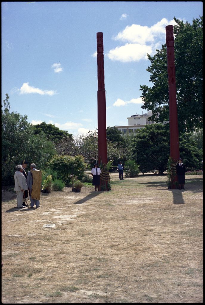 Images from the re-dedication of Te Marae o Hine on Saturday, 3 March, 1990. The following notes were written by City Archivist, Ian Matheson, around the time of the re-dedication. Background: Te Marae o Hine is that part of The Square on which stands the statue of Te Peeti Te Awe Awe and the City Council building. The name, The Courtyard of the Daughter of Peace was offered to Te Peeti Te Awe Awe one hundred and eleven years ago by Matene Te Whiwhi, Paramount Chief of Ngati Raukawa in memory of his ancestress, Rongorito, a famous peacemaker who lived in Waikato thirteen generations ago. Te Peeti Te Awe Awe received the name and offered it to the first Mayor of Palmerston North, George Snelson in the hope that there would be peace between all citizens of Palmerston North. 1990: The City of Palmerston North has commissioned a set of 9 great carvings to be placed in that part of The Square called Te Marae o Hine to form a gathering place for all people. The people of Rangitāne, tangata whenua of this area have imbued these taonga with their mana. They stand as a memorial to Rongorito and a tribute to the vision of Te Peeti Te Awe Awe, Matene Te Whiwhi and George Snelson.