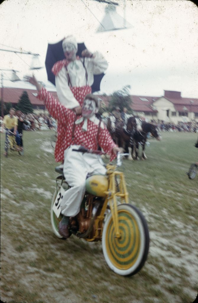 Clowns on a bicycle entertaining the crowd watching the Floral Festival parade at the Palmerston North Showgrounds in Pascal Street.