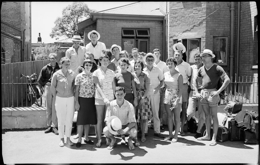 This image was taken for a story that ran in The Manawatu Evening Standard on 20 January, 1959. "Oblivious of the boater hat being waved behind him by Ong Choom Lim, the Olympic backstroke champion, D. Theile, stands with the Australian Universities touring swimming team on arrival in Palmerston North yesterday. Thiele (third from right) thrilled Manawatu enthusiasts with his brilliant swimming in the municipal pool last night. Ong Choom Lim is a Universities freestyle champion and former Asian relay team member."