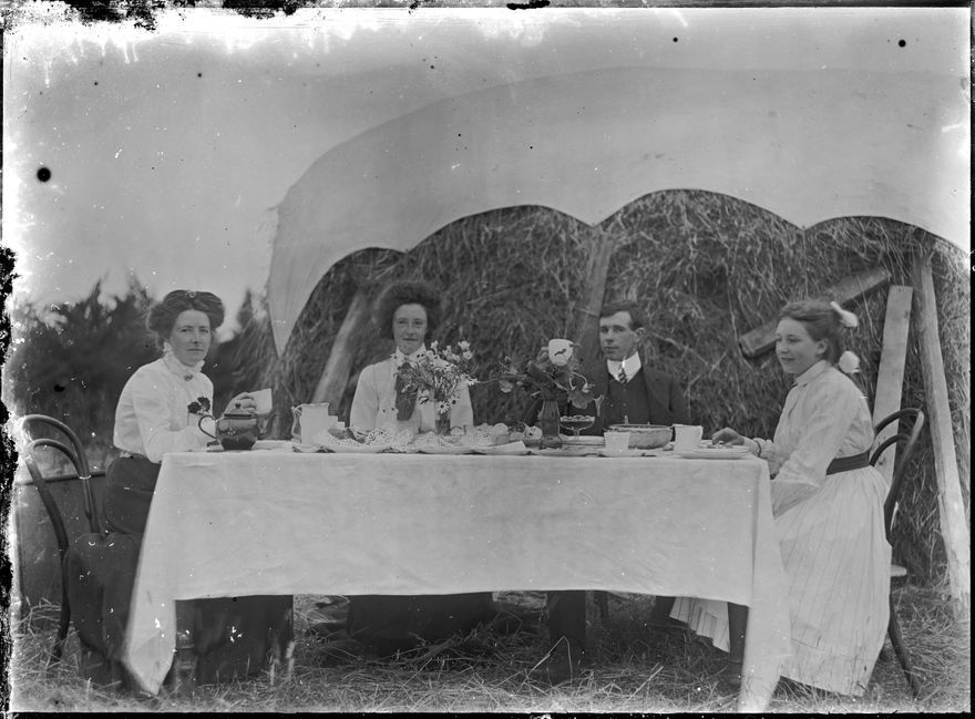 This photograph was created by William James Young in the early 20th century. A large variety of subjects are depicted in the collection, but family, rural life and travel are the most prominent themes. The exact location of the photographs in the Young Collection is unknown, but W J Young lived on a farm in Mt Stewart, Rangitikei, and some of the photographs include his house. The Young family were apparently avid travellers and photographs later in the collection feature scenes from Rotorua, Auckland, Whanganui, as well as other unidentified locations. The portraits are all unidentified, but are presumably of members of the Young family. The photographers parents were George Henry (b 1833) and Jane McDowell (b 1842, d 1916). They came to New Zealand in 1877. The same year, they bought the home farm on Mt Stewart and called it Kilrudden after Kilrudden House, the home of the McDowell family in Ireland. The couple had four children: Ann (b 1873), Margaret (b 1876), John (b 1878) and William James (b 1880). William James married Mary Elizabeth Thompson and they had four children: Doris (b 1914, d 1989), George (b 1916, d 1991), Royden McDowell (b 1925, d 1992) and Noel William (b 1927, d 2013).