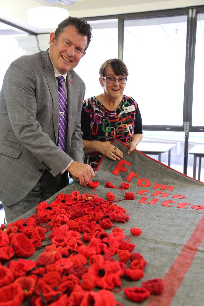 Mayor Grant Smith, was the first to hand-stitch one of hundreds of poppies to an Anzac Quilt, assisted by Robyn Wilson.