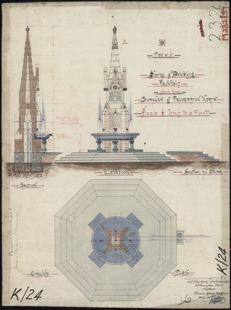 Plan for what became the Coronation Fountain in The Square. It was built in 1902 and was moved from the centre of the Square to opposite what is now the City Library in 1926, and then to near the corner of Broadway and The Square in 2005.