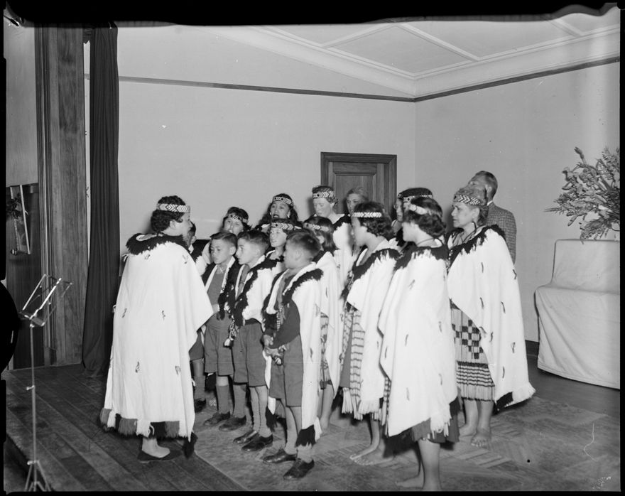 This image was taken for a story that ran in The Manawatu Evening Standard on 29 October, 1959. "Members of the Maori choir are shown above during their vocal item at the first Manawatu choral festival held in the St. Andrews Hall last night. Miss Molly Atkinson gave constructive criticism on the various items and expressed a wish to see each of the groups individually before the next festival."