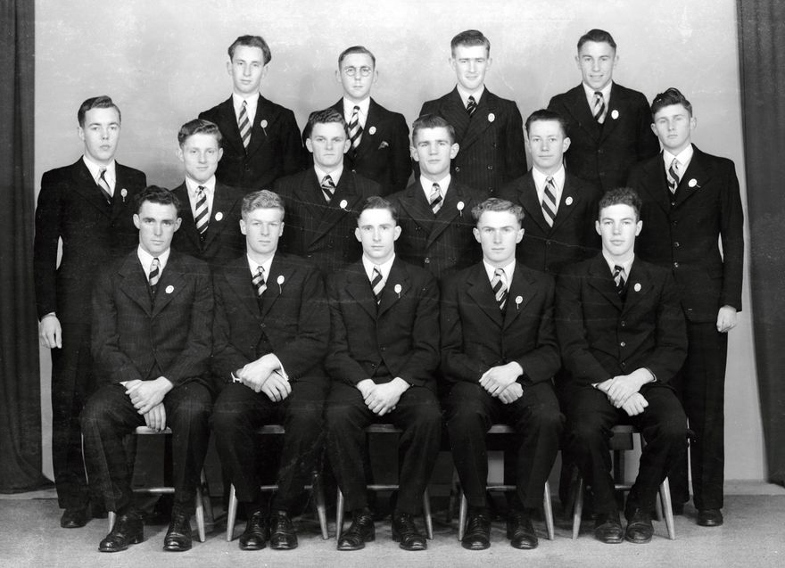 Back row, from left: Ogier, Craighead, Colquhoun, Petersen. Middle row, from left: Pope, Andrews, Smith, Hollows, Coulter, Brookie. Front row, from left: Buckley, Adcock, Mewett (head), Heaphy, Joblin.