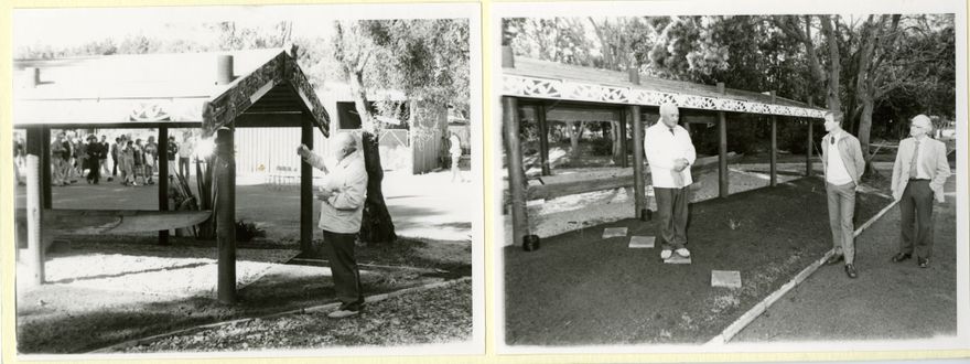 I tukua ngā karakia e te kaumātua hei whakapainga. The Minister of Lands & Forests viewing a shelter built to house a 150 year old canoe that was washed up on Santoft Beach in 1965.Two Photographs. To access these images, please contact us.