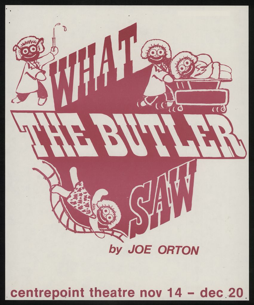"What the Butler Saw by Joe Orton. Centrepoint Theare, Nov 14 - Dec 20." Part of a collection of posters that were displayed in the Public Library in the 1970s - 1980s.