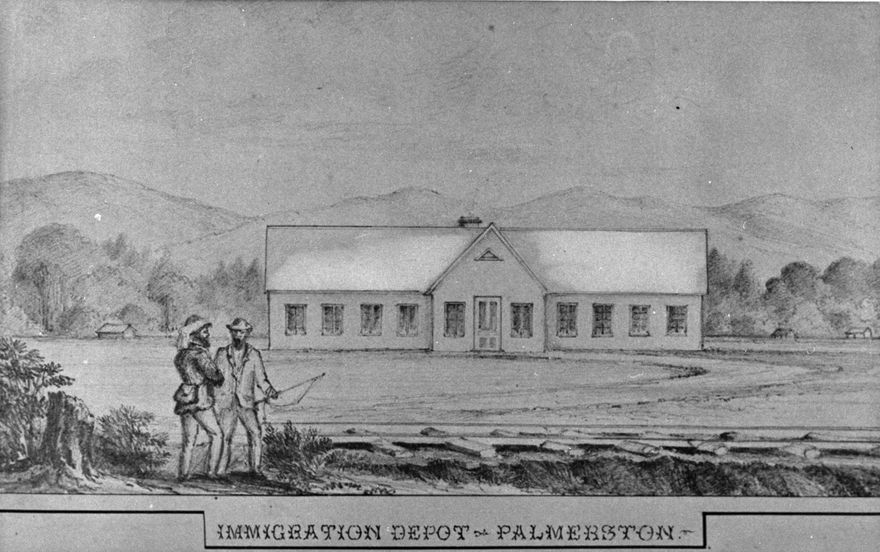 The building was situated in Main Street East on the corner of Ruahine Street. It was constructed in 1873 to provide temporary accommodation for immigrants arriving in the district and was first used by the Feilding settlers brought to New Zealand by the Emigrant and Colonist's Aid Corporation (1874). The building was later made available to the Palmerston North Borough Council for hospital purposes and was used for housing injured persons prior to their transfer to Wanganui Hospital. The image shown is a from a photograph of a sketch done in 1874 by Mary Halcombe, wife of A W F Halcombe, agent for the Emigrant and Colonist's Aid Corporation.