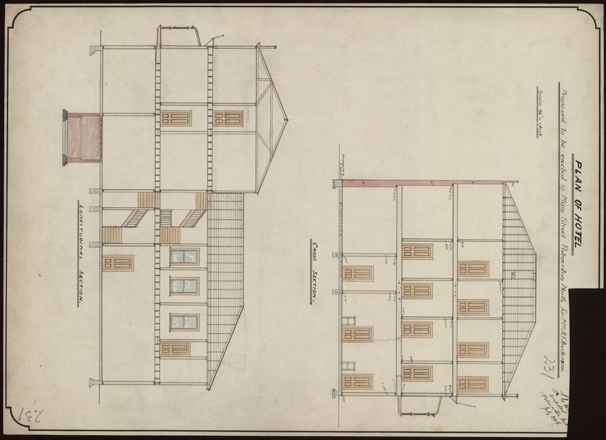 This plan for a proposed three-storey hotel was designed by L. G. West for A. F. Anderson. The Danish-born architect Ludolph Georg West (1846-1919) established an architectural practice in Palmerston North in about 1880. In 1912 he formed a partnership with his son, Ernest Vilhem West, who continued the business after his father's death.