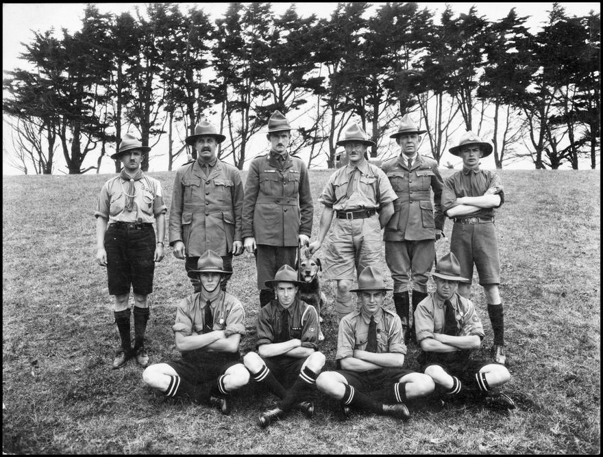 Five scoutmasters, five scouts and a dog stand in front of a row of trees. "Toothbrush" moustaches such as those displayed by three of the men went out of fashion after Adolf Hitler came to power.