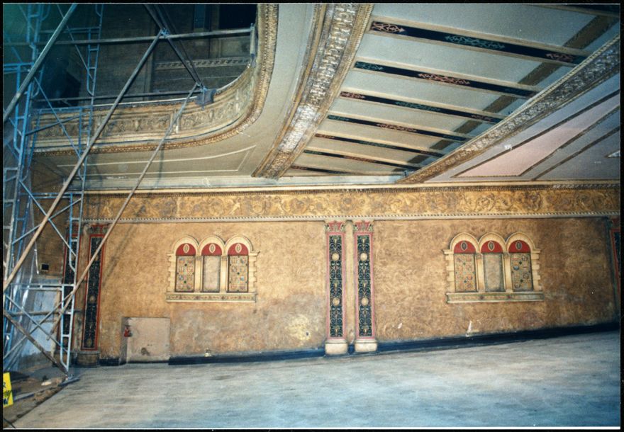 The Regent Theatre under construction during re-development work in 1996-1997. The Regent Theatre was built by the Australasian cinema and theatre chain J.C. Williamson Limited. Williamson's began its New Zealand operation in 1926. The theatre, one of several Regents built throughout New Zealand and Australia at this time, was a dual-purpose cinema and theatre. The Melbourne architect Charles Hollinshed was hired to design the building which was completed in 1930 at a cost of £46,000, becoming the largest and most lavish auditorium in the city. It retained its twin functions for much of its life, before falling into relative disuse and eventually closing in 1991. The Palmerston North City Council purchased the building 1993 and began restoration work in 1996. The Regent Theatre is a now rare survivor of the heyday of the theatre/cinema. As the only such venue in Palmerston North to survive to this day, the Regent is of great social importance to the city. The exterior design, and to a much greater degree, interior design are remarkably authentic and rare examples of theatre design in New Zealand, and as such, the Regent is a landmark building in type and style. The exterior is built in the Art Deco style, while the interior is Persian painted plaster ornament. The external symmetry, vertical fins, shallow stylised relief, stepped skyline, and chevron ornament are typical of the Art Deco style. The main entrance, with walls of coloured plaster and travertine, leads into a large barrel-vaulted, double height space, off which there are the entrances to the main performance space. The interior decoration of the theatre is taken directly from Owen Jones' book on design, “Grammar of Ornament.” The auditorium seats 1393 people in a two-tier circle and stalls arrangement (originally it accommodated 1600 guests). Architect, Charles Hollinshed graduated from Sydney University in 1922, one of the first three graduates in architecture in Australia. With A.H. Walkely, Hollinshed practised in Melbourne and the firm specialised in theatre and cinema design. One of their best-known designs was Her Majesty's Theatre, Melbourne (1934). Hollinshed also design Hoyts Limited (with Richard Gailey) the celebrated "Spanish Gothic" Regent Theatre, Brisbane (1929), now demolished.