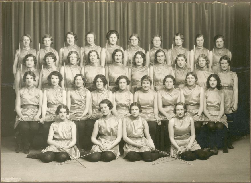 This image shows a group of women in costume, possibly for a Palmerston North Girls' High School theatrical production. Jean Torstonson (nee McPherson) can be seen third from right on the second row from the front.