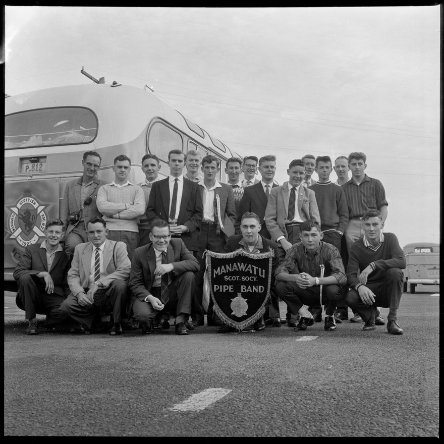 This image was taken for a story that ran in The Manawatu Evening Standard on 28th March, 1963. "Two city pipe bands left early this morning on their way to Rotorua. They will compete in the national championships which will be held from Friday until Sunday. The top photograph shows the Manawatu Scottish Society's Pipe Band which will compete in the B grade, and the lower group is the City of Palmerston North Pipe Band, which will complete the C grade."