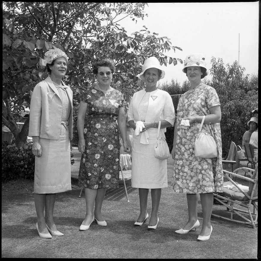 This image was taken for a story that ran in The Manawatu Evening Standard on 26 January, 1964. "While their husbands were occupied with the more serious business of the New Zealand veterinary conference which opened at the Massey University of the Manawatu this morning, the wives were the guests at an outdoor luncheon given by Mrs I. J. Cunningham, wide of the dean of the newly established veterinary faculty at the university, at her home in Featherson Street. In the group above, taken during the luncheon, are Mrs M. B. Buddle, wife of the president of the association; Mrs I. J. Cunningham, hostess, Mrs J. F. A. Sprent, whose husband is a guest speaker at the conference, and Mrs B. Johnston, a chief executive member of the council."